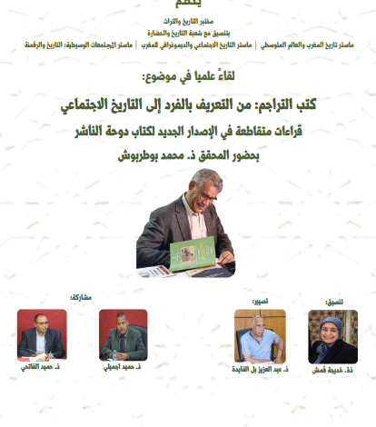 لقاء علمي في موضوع: كتب التراجم من التعريف بالفرد إلى التاريخ الاجتماعي   لقاء علمي دوحة الناشر ذ بوطربوش