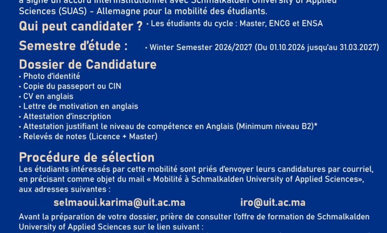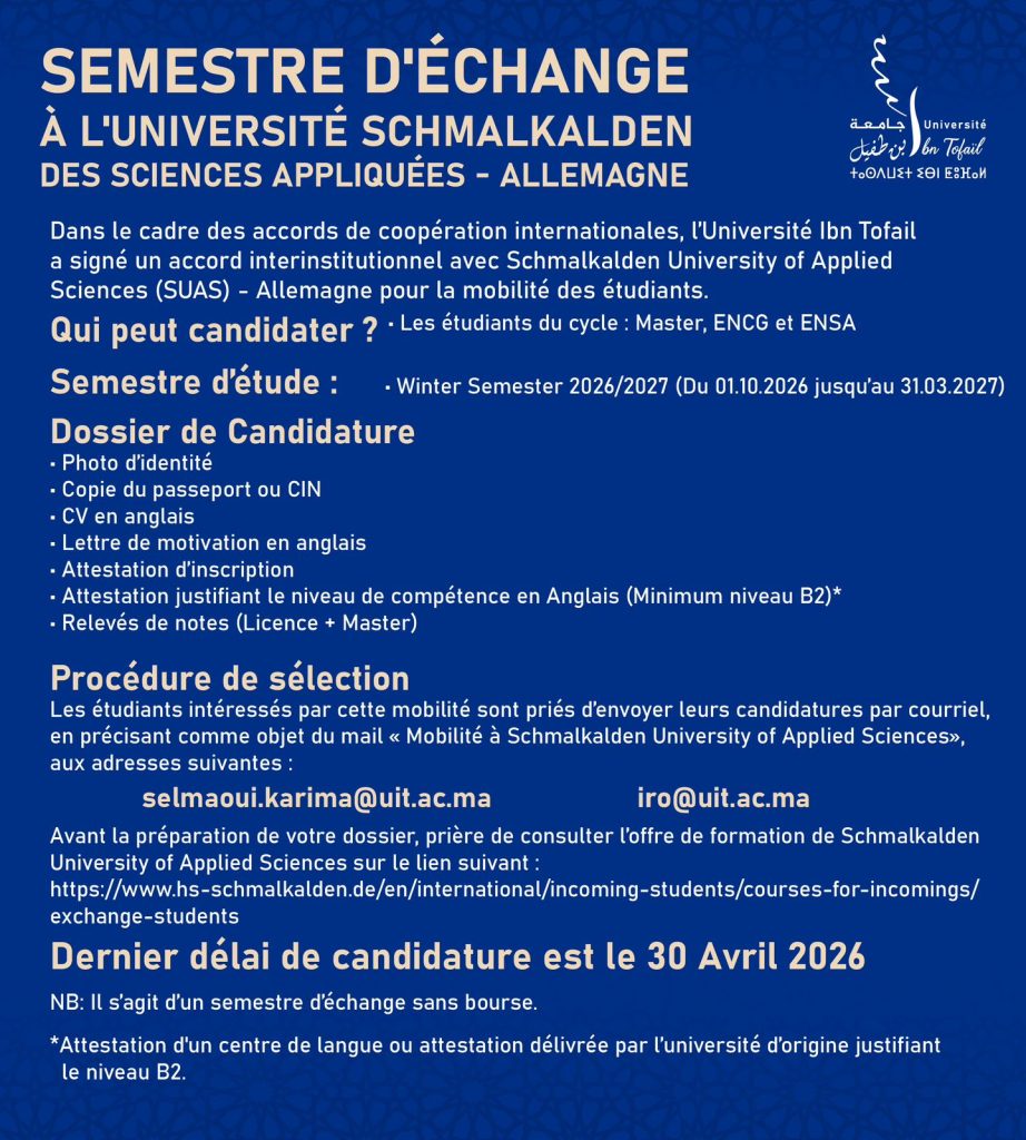 The post Semestre d’échange appeared first on Univesité Ibn Tofail.
