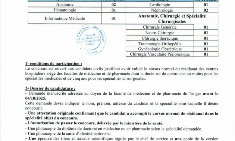 La Faculté de Médecine et de Pharmacie de Tanger organise un concours pour le recrutement de 13 Maîtres de Conférences (Session 03/11/2025).