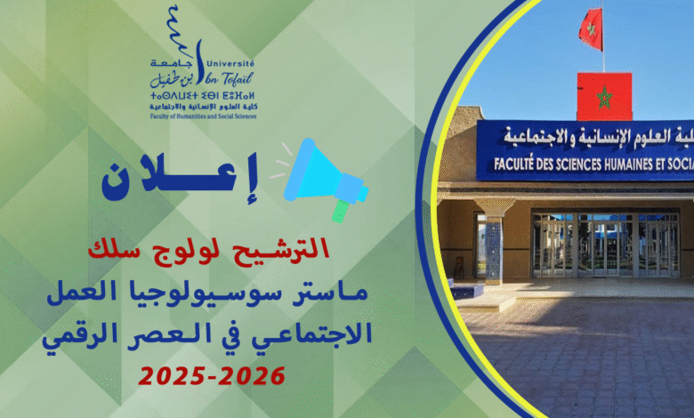 L’article إعلان بخصوص الترشيح لولوج سلك ماستر سوسيولوجيا العمل الاجتماعي في العصر الرقمي 2025-2026 est apparu en premier sur Faculté des Sciences Humaines et Sociales – Kénitra.
