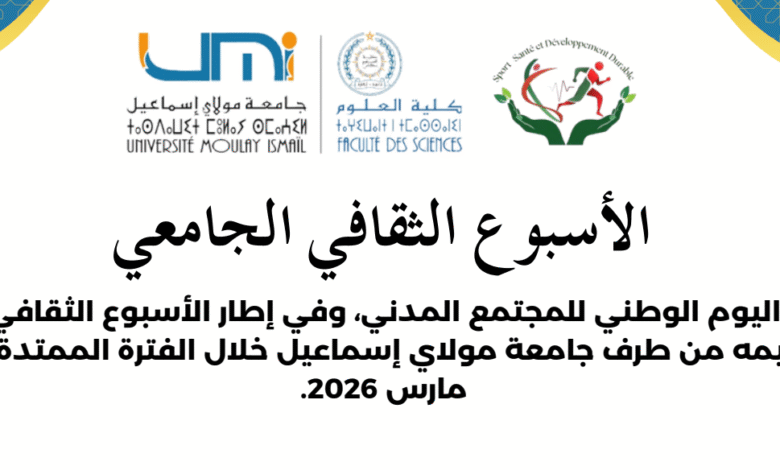 L’article الأسبوع الثقافي الجامعي – ورﺷﺎت اﻟﻨﺸﺎط اﻟﺒﺪﻧﻲ est apparu en premier sur Faculté des sciences de Meknès.