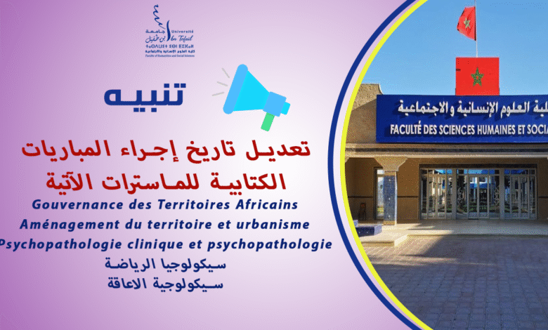 L’article تعديل تاريخ إجراء المباريات الكتابية لبعض الماسترات est apparu en premier sur Faculté des Sciences Humaines et Sociales – Kénitra.