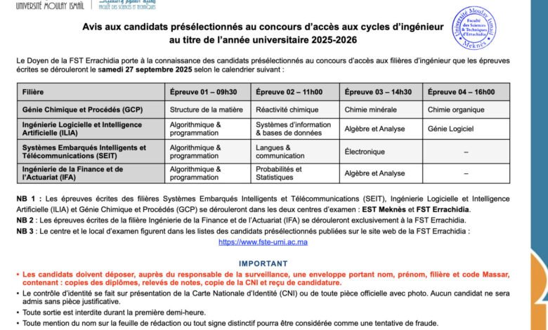 Avis aux candidats présélectionnés au concours d’accès aux cycles d’ingénieur au titre de l’année universitaire 2025-2026