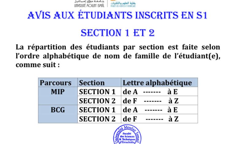 Avis aux étudiants inscrits en S1 Section 1 et 2