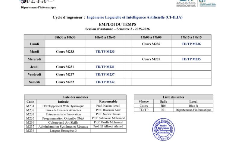 Cycle d’ingénieur : Ingénierie Logicielle et Intelligence Artificielle (CI-ILIA) EMPLOI DU TEMPS Session d’Automne – Semestre 3 – 2025-2026