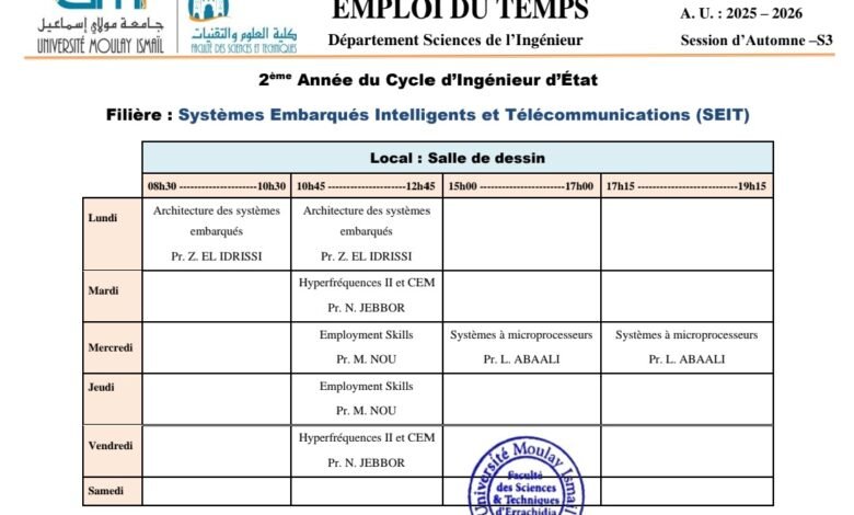 Cycle d’ingénieur : Systèmes Embarqués Intelligents et Télécommunications (CI-SEIT) EMPLOI DU TEMPS Session d’Automne – Semestre 3 – 2025-2026