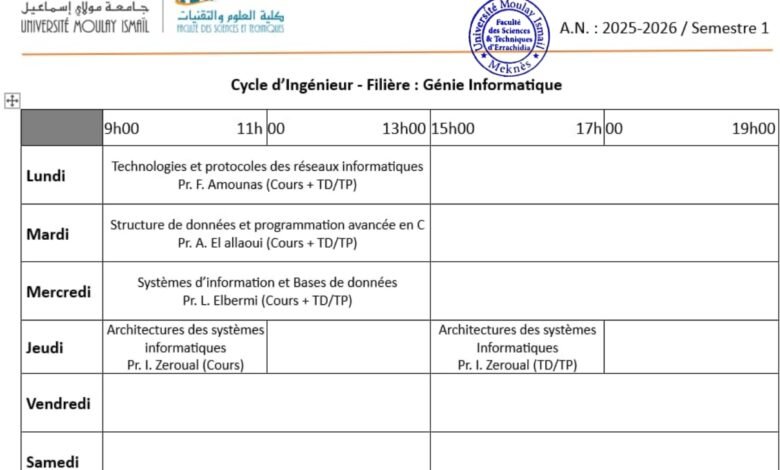 Emploi du Temps – Cycle d’Ingénieur Génie Informatique (Semestre 1 – 2025/2026)