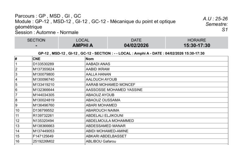 الرئيسية/الكليات المغربية/كليات العلوم و التقنيات FST/Planning et Locaux d’Examen du 4 Février 2026 كليات العلوم و التقنيات FST Planning et Locaux d’Examen du 4 Février 2026 Rachid Ahitass أرسل بريدا إلكترونيا منذ 4 أيام0 0 أقل من دقيقة فيسبوك X لينكدإن بينتيريست Reddit Pocket ماسنجر ماسنجر واتساب تيلقرام مشاركة عبر البريد طباعة B233_Normale MIPC-12 BG-12 Libre Source link نسخ الرابط تم نسخ الرابط Rachid Ahitass أرسل بريدا إلكترونيا منذ 4 أيام0 0 أقل من دقيقة فيسبوك X لينكدإن بينتيريست Reddit Pocket ماسنجر ماسنجر واتساب تيلقرام مشاركة عبر البريد طباعة شاركها فيسبوك X لينكدإن بينتيريست Reddit Pocket ماسنجر ماسنجر واتساب تيلقرام ڤايبر مشاركة عبر البريد طباعة