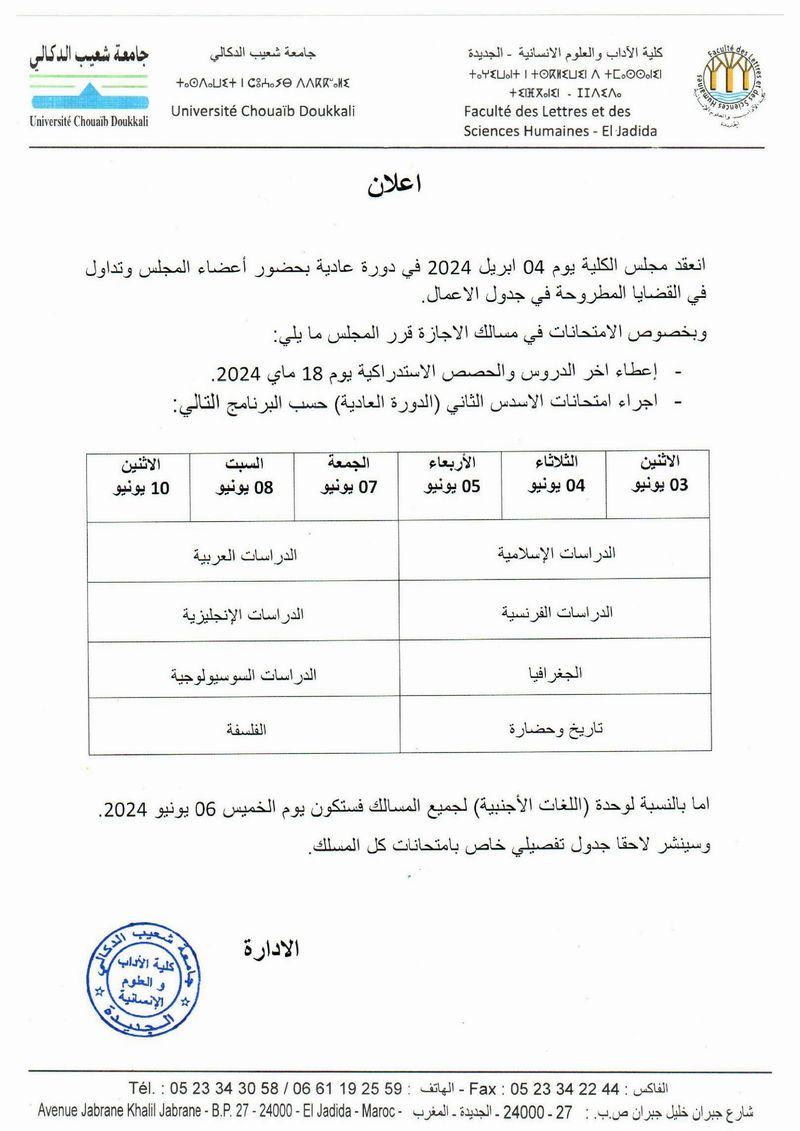 إعلان حول إجراء الامتحانات العادية للدورة الربيعيةبرسم السنة الجامعية 2024/2023 – FLSHJ