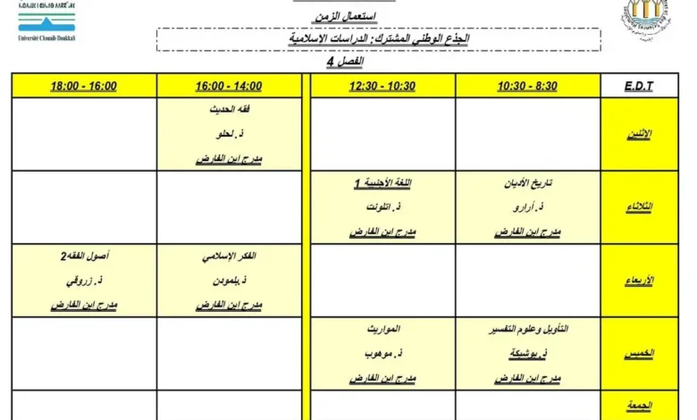 استعمالات الزمن للفصل الثاني و الرابع و السادس لمسلكي الدراسات العربية و الإسلامية