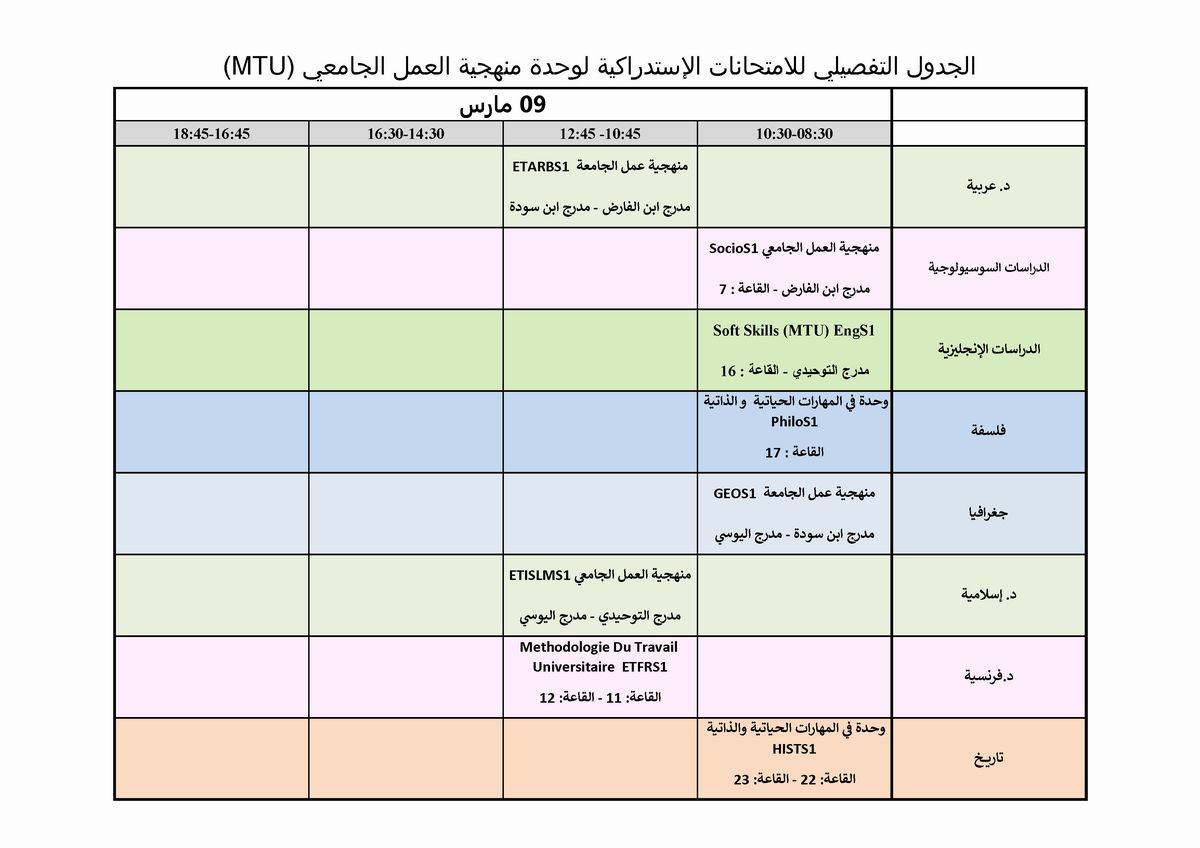 الجدول التفصيلي للامتحانات الإستدراكية لوحدة منهجية العمل الجامعي ( MTU )