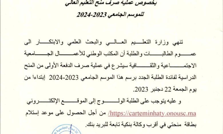 بخصوص عملية صرف منح التعليم العالي لفائدة الطلبة الجدد
