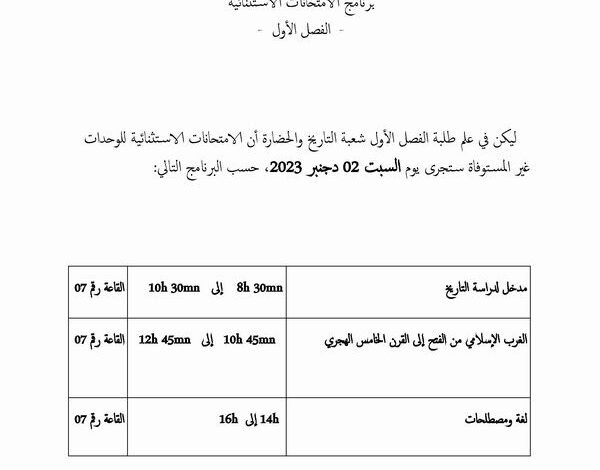 برنامج الامتحانات الاستتنائية للفصل الأول