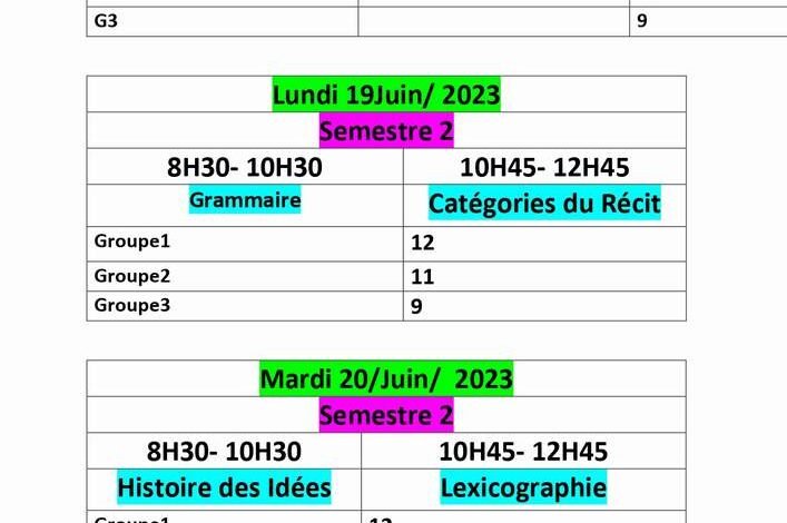 برنامج الامتحانات الاستدراكية للدورة الربيعية 2023/2022 مسلك الدراسات الفرنسية