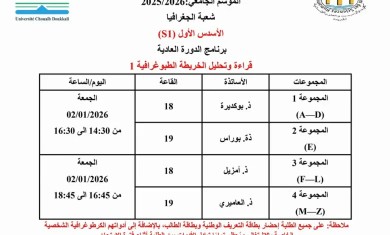 برنامج وحدة قراءة و تحليل الخريطة الطبوغرافية I الأسدس الأول (S1) الدورة العادية الموسم الجامعي 2026/2025 – FLSHJ