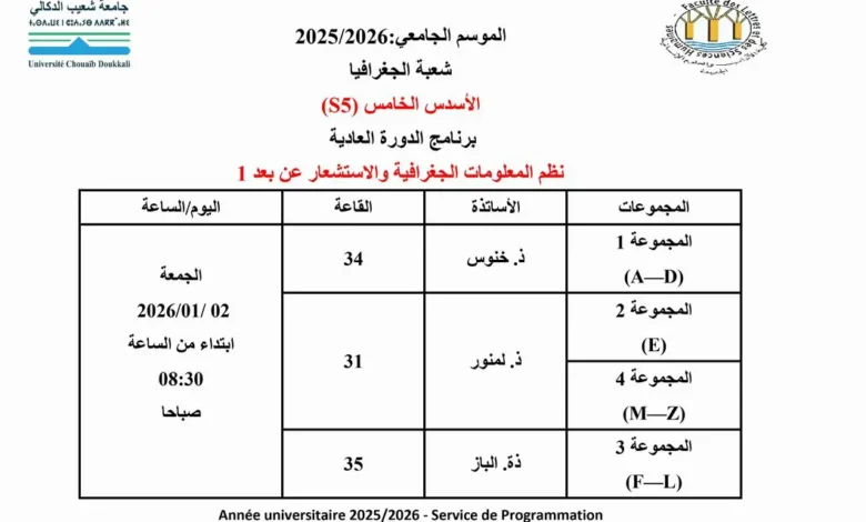 برنامج وحدة نظم المعلومات الجغرافية و الاستشعار عن بعد I الأسدس الخامس (S5) الدورة العادية الدورة الموسم الجامعي 2026/2025 – FLSHJ