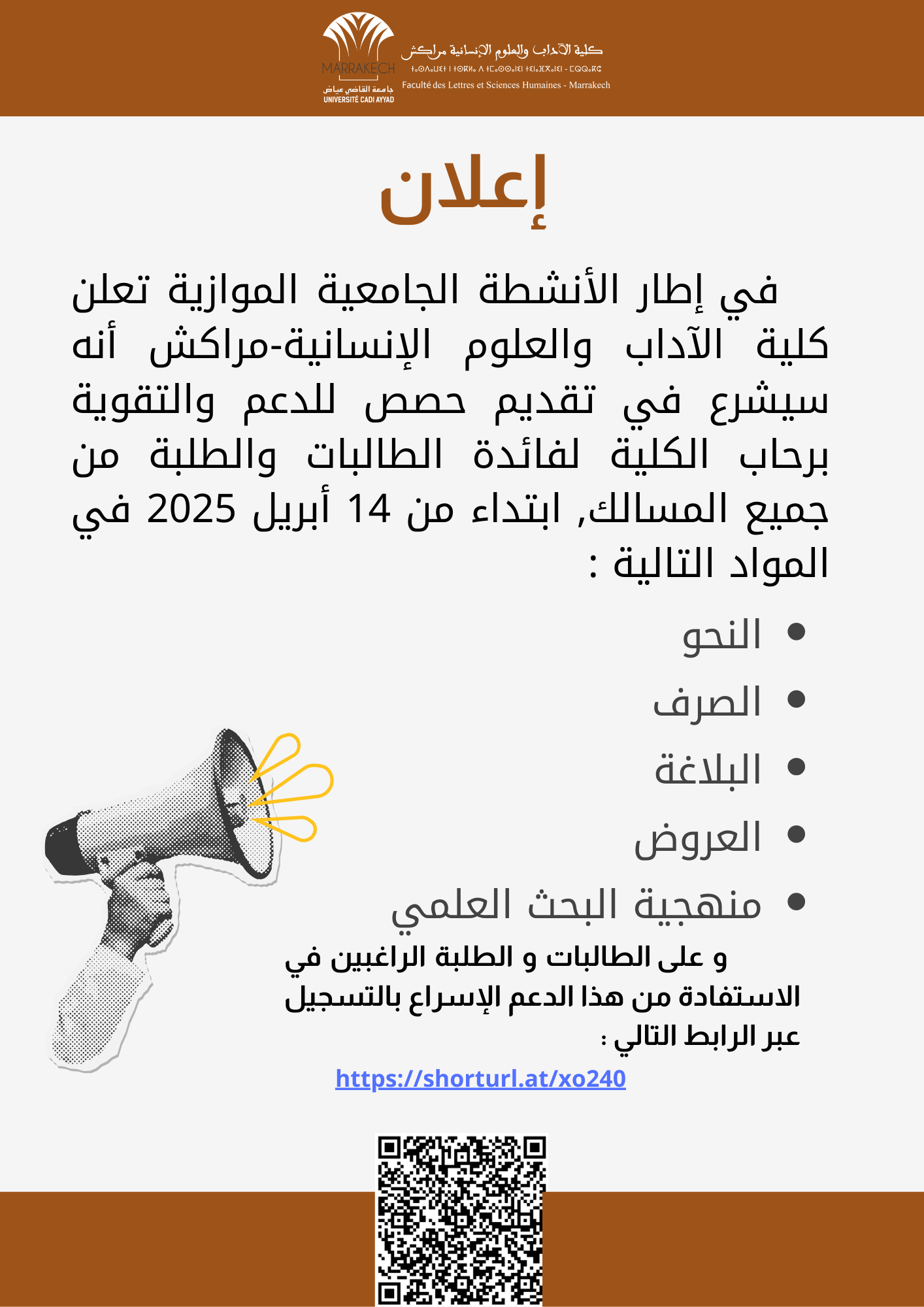 L’article تقديم حصص للدعم والتقوية لفائدة الطالبات والطلبة من جميع المسالك est apparu en premier sur Faculté des Lettres et Sciences Humaines Marrakech.