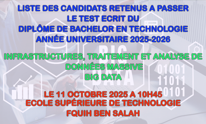 Avis et liste des candidats retenus à passer le test écrit du Diplôme de Bachelor en Technologie Infrastructures, Traitement et Analyse de données Massives (BIG DATA) au titre de l’année universitaire 2025-2026