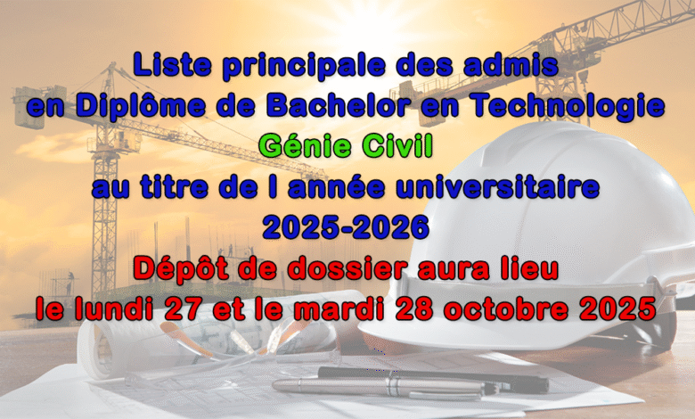 Liste principale des admis en Diplôme de Bachelor en Technologie « Génie Civil » au titre de l’année universitaire 2025-2026
