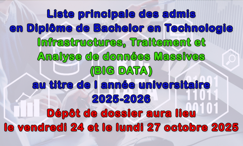 Liste principale des admis en Diplôme de Bachelor en Technologie « Infrastructures, Traitement et Analyse de données Massives (BIG DATA) » au titre de l’année universitaire 2025-2026