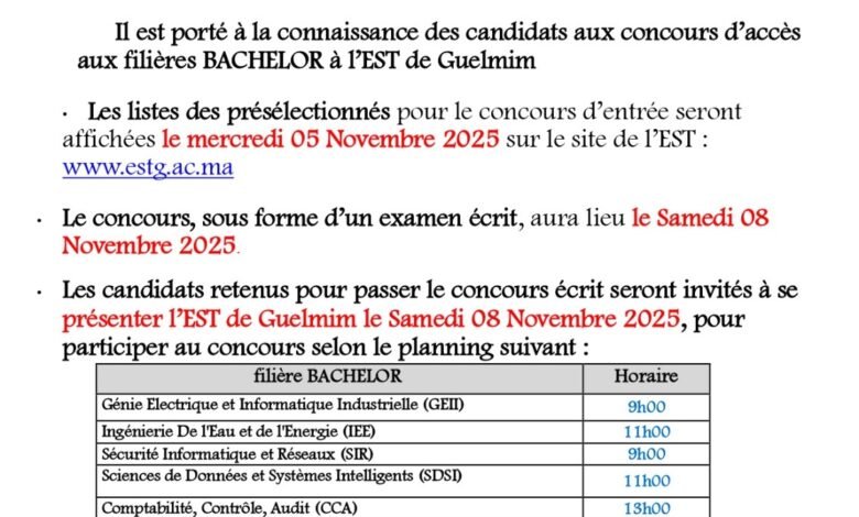 Liste des candidats convoqués pour le concours écrit d’accès au Diplôme de Bachelor GEII, IEE, SIR, SDSI et CCA A.U :2025-2026