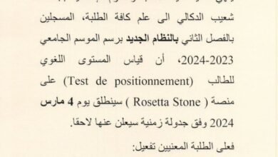 إعلان عن قياس المستوى اللغوي لطلبة الفصل الثاني المسجلين بالنظام الجديد برسم الموسم الجامعي 2024/2023 –