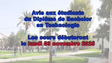 -      Rentrée universitaire 2025-2026 Diplôme de Bachelor en TechnologieIl est porté à la connaissance des étudiants du Diplôme de Bachelor en Technologie que les cours débuteront le lundi… أكمل القراءة »