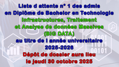 -      Liste d’attente des admis en Diplôme de Bachelor en Technologie « Infrastructures, Traitement et Analyse de données Massives (BIG DATA) » au titre de l’année universitaire 2025-2026Les candidats dont les noms figurent sur la liste d’attente ci-dessous sont convoqués à se présenter au service… أكمل القراءة »