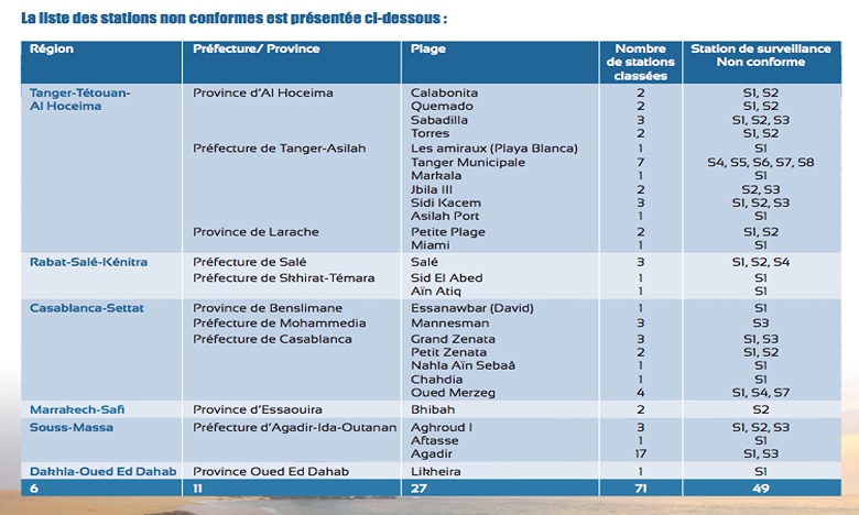 Elle a expliqué dans ce sens que la surveillance de la qualité des eaux de baignade est organisée par le Laboratoire National d’Etudes et de Surveillance de la Pollution (LNESP), relevant du ministère. En ce qui concerne l’évaluation des eaux de baignade, elle se fait conformément à la Norme Marocaine NM 03.7.199. Cette norme est appliquée sur toutes les plages surveillées, depuis 2019. Elle consiste à instaurer une gestion proactive de la qualité des eaux de baignade basée sur leur classification et sur l’établissement des profils des eaux de baignade, qui constituent des outils d’aide à la décision et permettent également de valoriser les actions entreprises par les gestionnaires des plages pour l’amélioration de la qualité des eaux de baignade. "Sur les 495 stations de prélèvements, seules 410 ont fait l’objet d’un nombre suffisant de prélèvements pour le classement, ainsi 361 stations (soit 88,05%) ont été déclarées de qualité microbiologique conforme aux exigences de la NM.03.7.199", note le rapport.