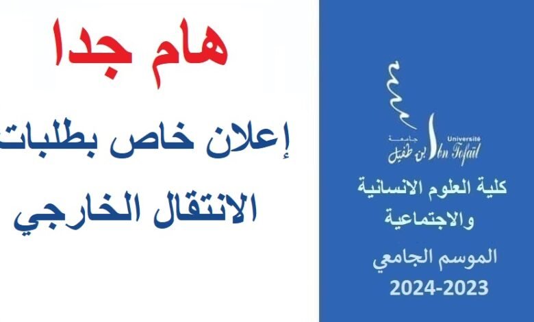 تنزيلا لإجراءات انتقال الطلبة ما بين الجامعات وفقا لمقتضيات المخطط الوطني لتسريع تحول منظومة التعليم العالي، ينهي عميد كلية العلوم الإنسانية و الاجتماعية إلى علم الطلبة المسجلين برسم السنة الجامعية 2023-24 في إحدى الجامعات الوطنية والذين تقدموا بطلب عبر المنصة الالكترونية لجامعة ابن طفيل، النقر على الرابط ادناه لاستكمال إجراءات التسجيل. https://ls.uit.ac.ma/reorientationexterne يرجى من الطلبة…