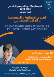 تنظم جامعة الحسن الأول بسطات الدرس الإفتتاحي للجامعة برسم الموسم الجامعي 2023-2024، تحت عنوان: العلوم الإنسانية و الإجتماعية و الذكاء الإصطناعي، تلقيه الدكتورة رحمة بورقية، أستاذة مبرزة و عضوة أكاديمية المملكة المغربية، و ذلك يوم الأربعاء 18 أكتوبر 2023 إبتداءا من الساعة الحادية عشر صباحا ، بالمدرج الرئيسي لكلية العلوم القانونية والسياسية التابعة للجامعة